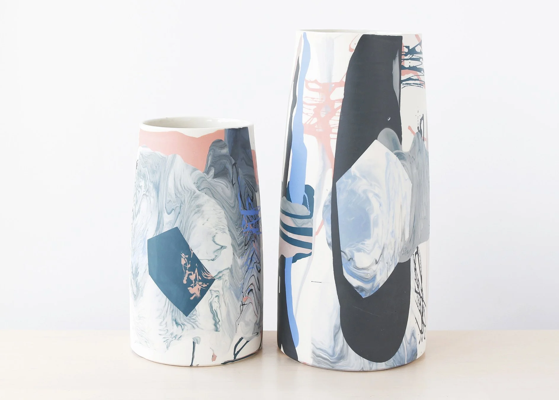 Using a mould as a canvas, and liquid tinted porcelain as paint, the Abstraction Series focuses on a way to paint in clay. Tinted porcelain is poured, painted, marbled, peeled away and revealed on the moulds before they are closed up and cast as one piece. Highly experimental and visually interesting, these vessels and plates are like paintings in the round, which can be turned in various ways for a new view of the work.